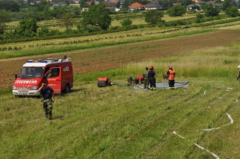 Auf einem Außenlandeplatz bei einer Waldlichtung wurde die Waldbrandbekämpfung begonnen. Unser TLF wurde beim Tankpendelverkehr eingesetzt, mit dem ein zweiter und dritter Angriff zur Brandbekämpfung durchgeführt wurde. Die Mannschaft unseres Kleinlöschfahrzeugs baute am Waldrand einen Wasserbehälter auf, von dem aus mit unserer Tragkraftspritze der zweite Angriff gestartet wurde. Da es während der laufenden Übung in Trausdorf zu einem Wohnhausbrand kam, wurden wir und die Feuerwehr Rust sofort zum Einsatz abkommandiert. Die Übung wurde um ca. 13 Uhr erfolgreich beendet und im Anschluss wurden alle Beteiligten zu Speis und Trank eingeladen
