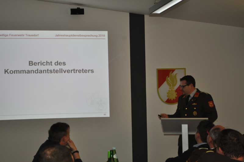 Am 19. Jänner 2018 fand unsere Jahreshauptdienstbesprechung im Seminarraum im Feuerwehrhaus statt. Anwesend waren neben unseren Feuerwehrmitgliedern und einiger unterstützender Mitglieder auch Vertreter des Bezirksfeuerwehrkommandos, der Polizeiinspektion St. Margarethen und natürlich der Gemeinde Trausdorf. Bei dieser Sitzung wurde ein Rückblick auf das Feuerwehrjahr 2017 gemacht und Statistiken über Mannschaftsstand, Einsätze und Finanzen präsentiert sowie eine kurze Vorschau auf die Aktivitäten und geplanten Anschaffungen im Jahr 2018 gegeben.