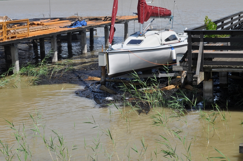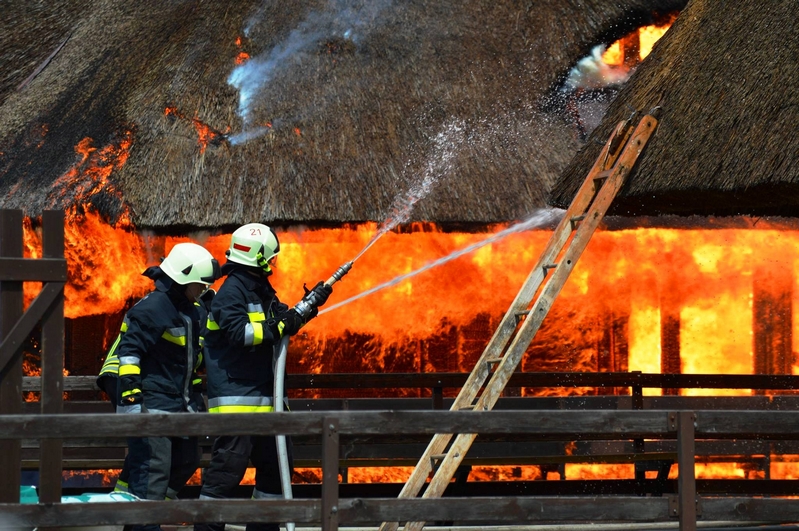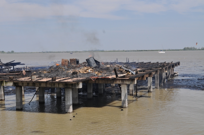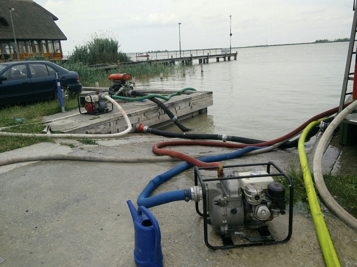 Schon von weitem waren die Rauchschwaden zu erkennen. Mehrere zweistöckige Seehütten standen im Vollbrand. Unsere Aufgabe war es unsere Tragkraftspritze und den Wasserwerfer mit Lafette bereitzustellen. Danach wurden wir auf den Steg geschickt, um dort die noch brennenden Hütten gemeinsam mit den ungarischen Kollegen abzulöschen und ein übergreifen auf den Steg zu verhindern.